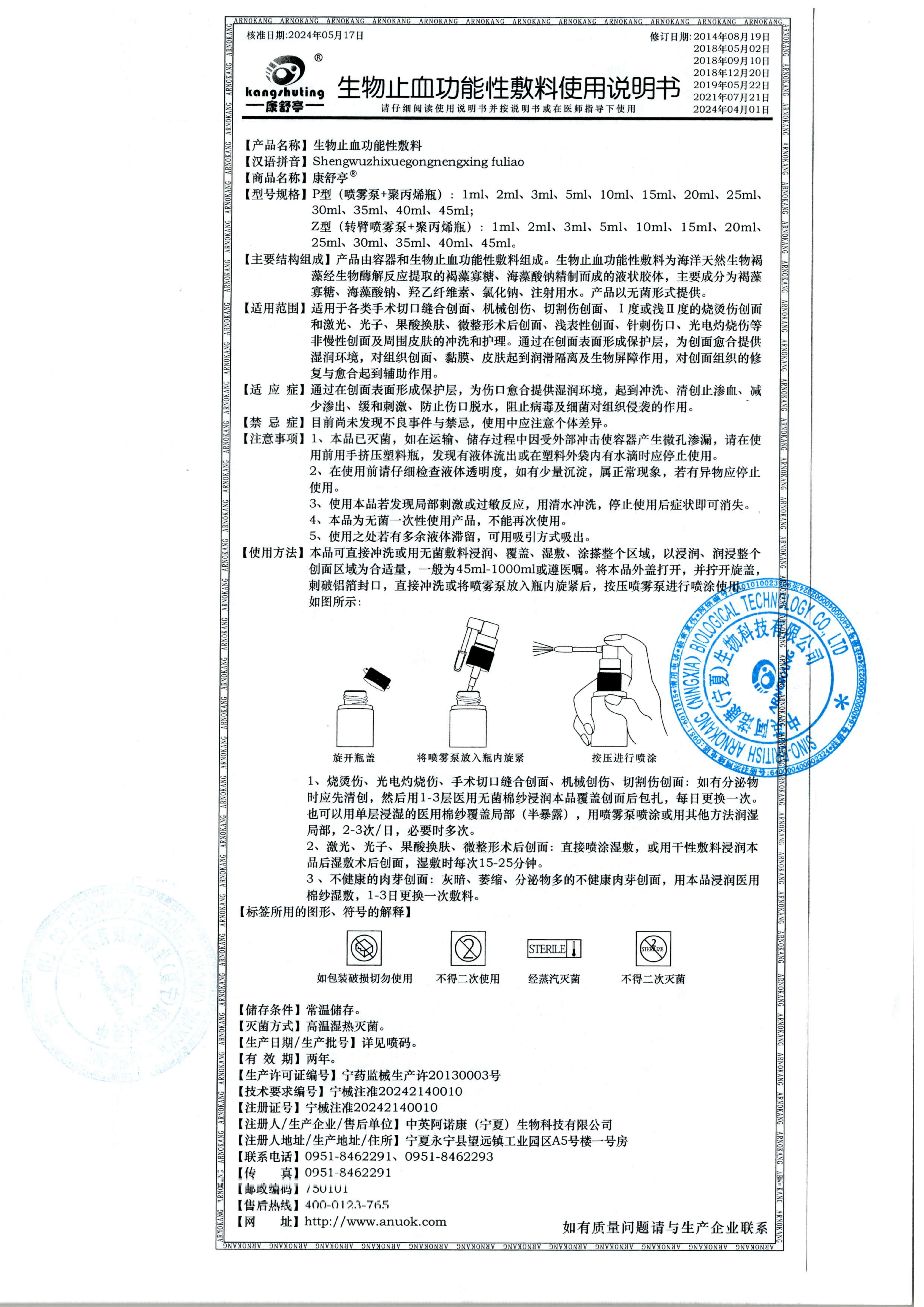 生物止血功能性敷料,通过在创面表面形成保护层,为创面愈合提供湿润环境,对组织创面、黏膜、皮肤起到润滑隔离及生物屏障作用,对创面组织的修复与愈合起到辅助作用。